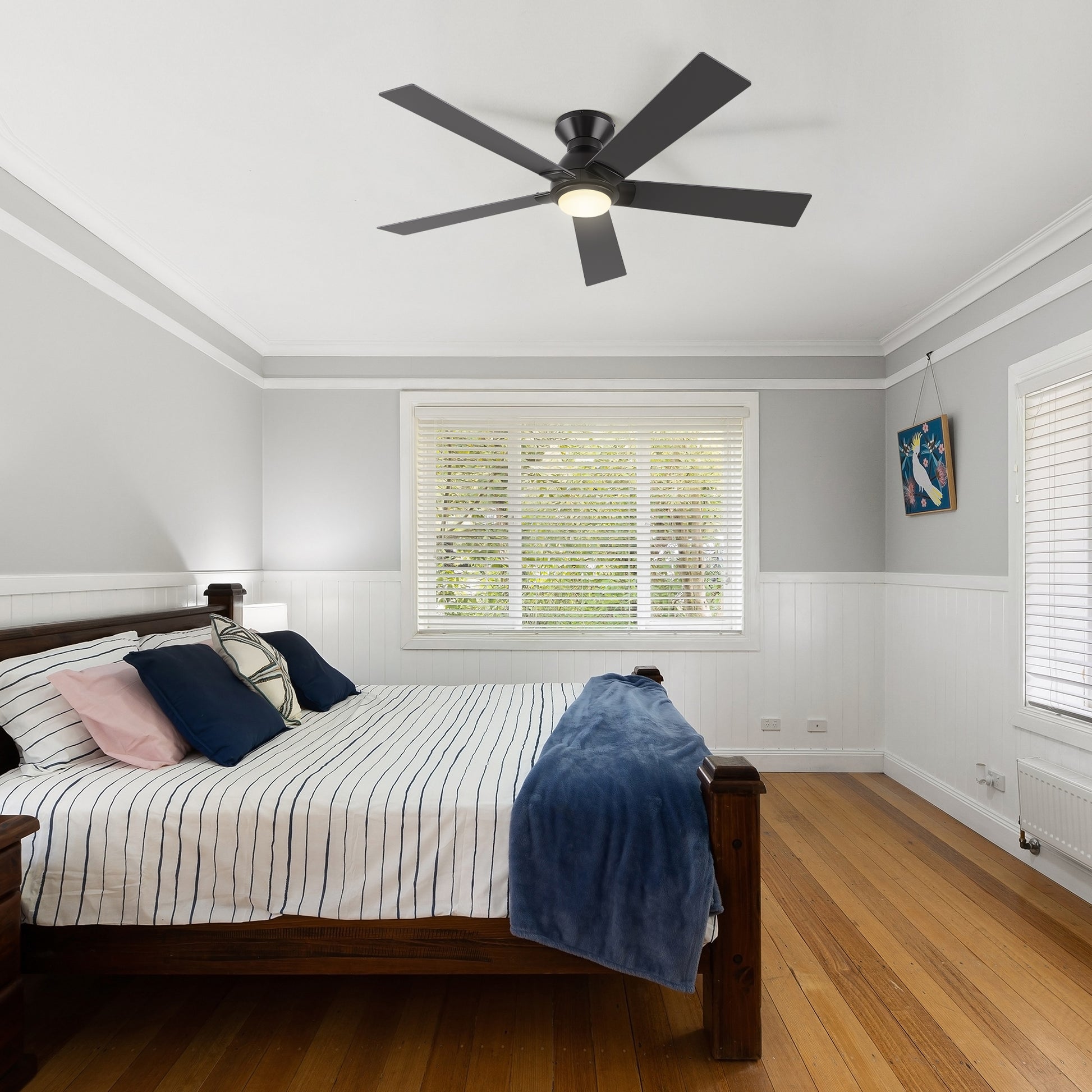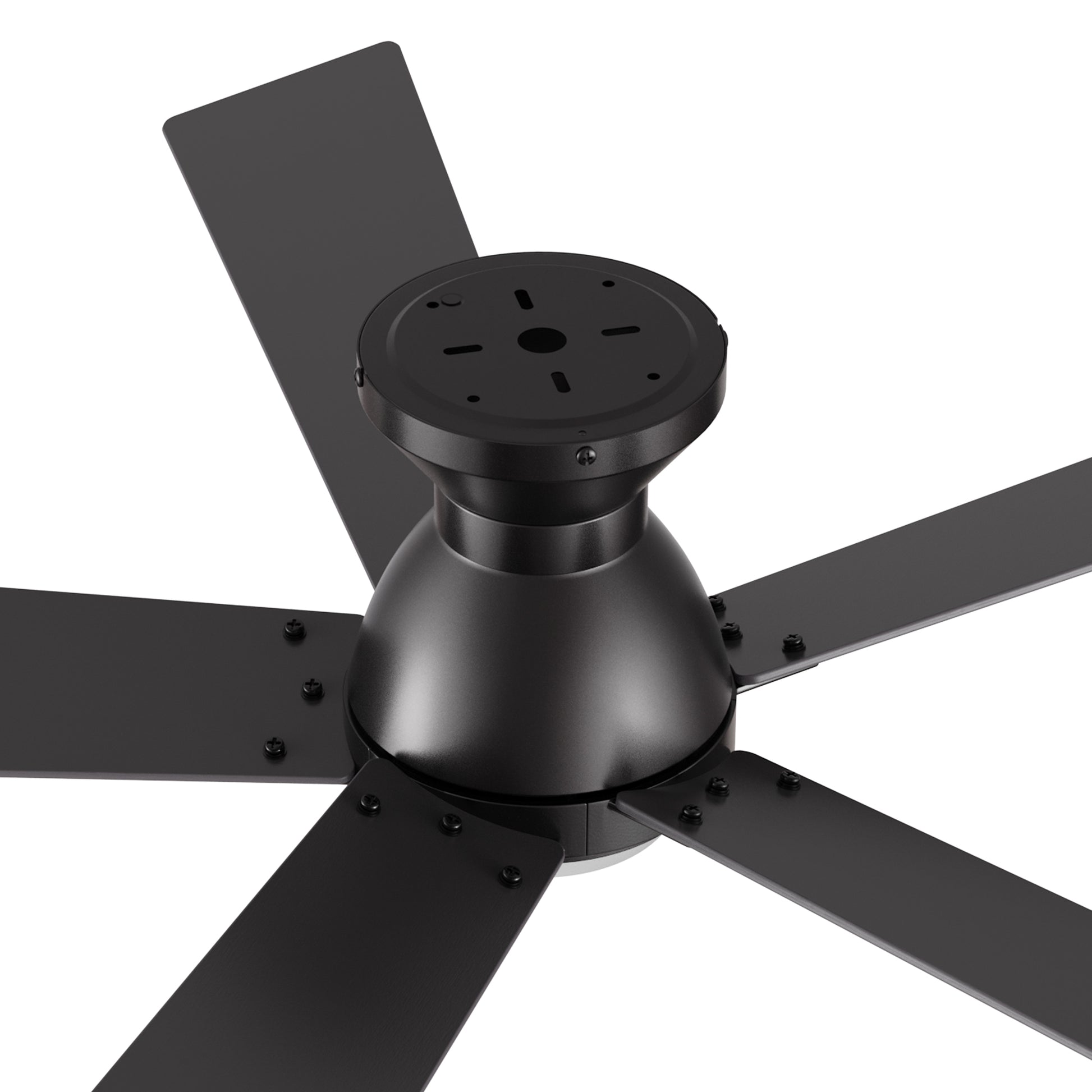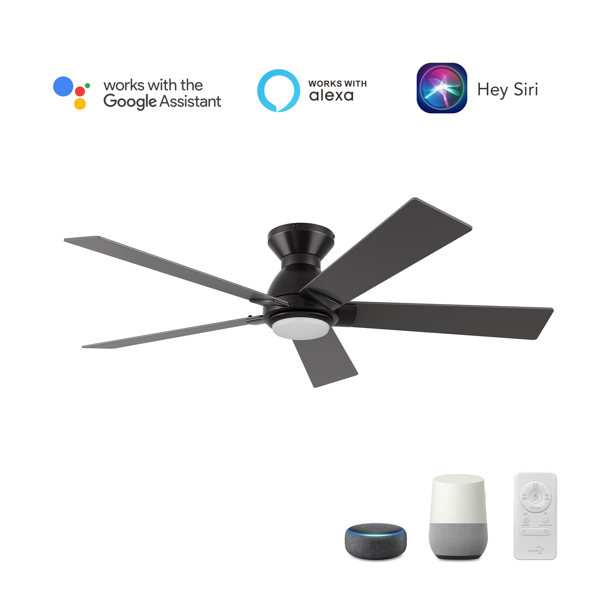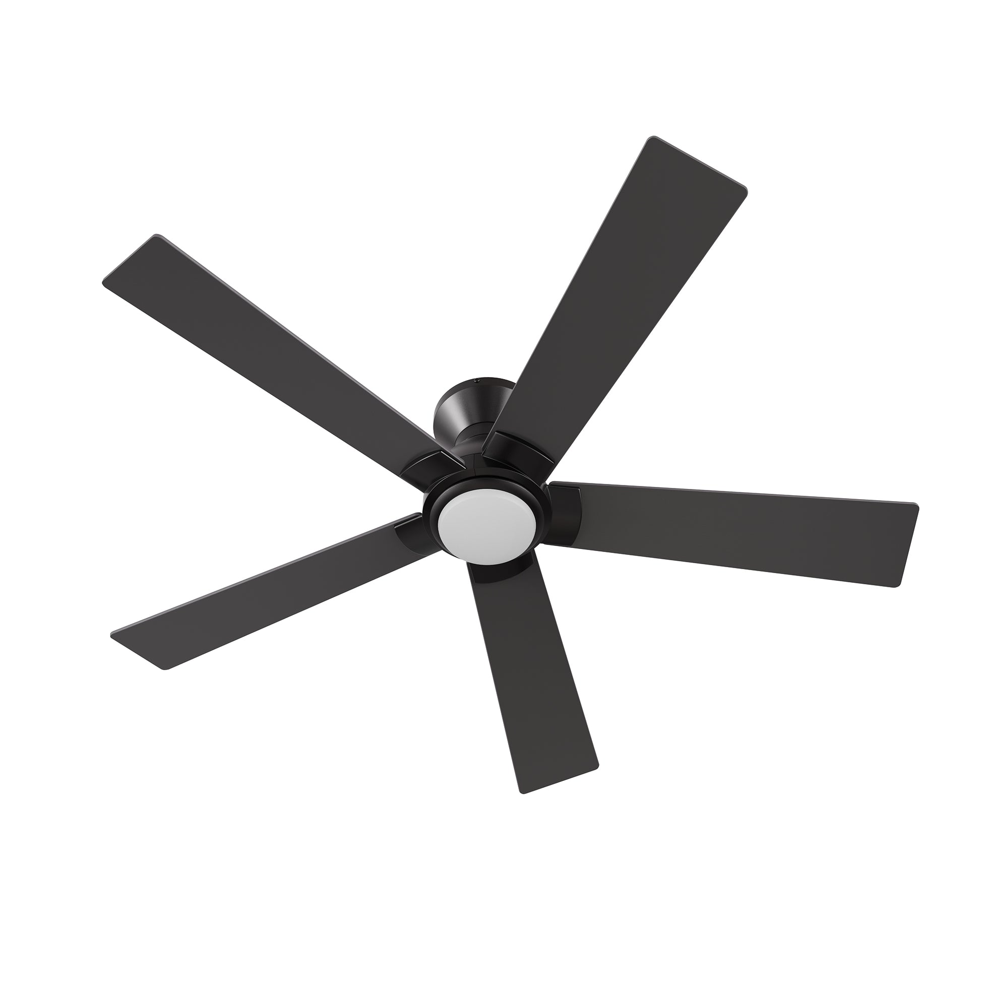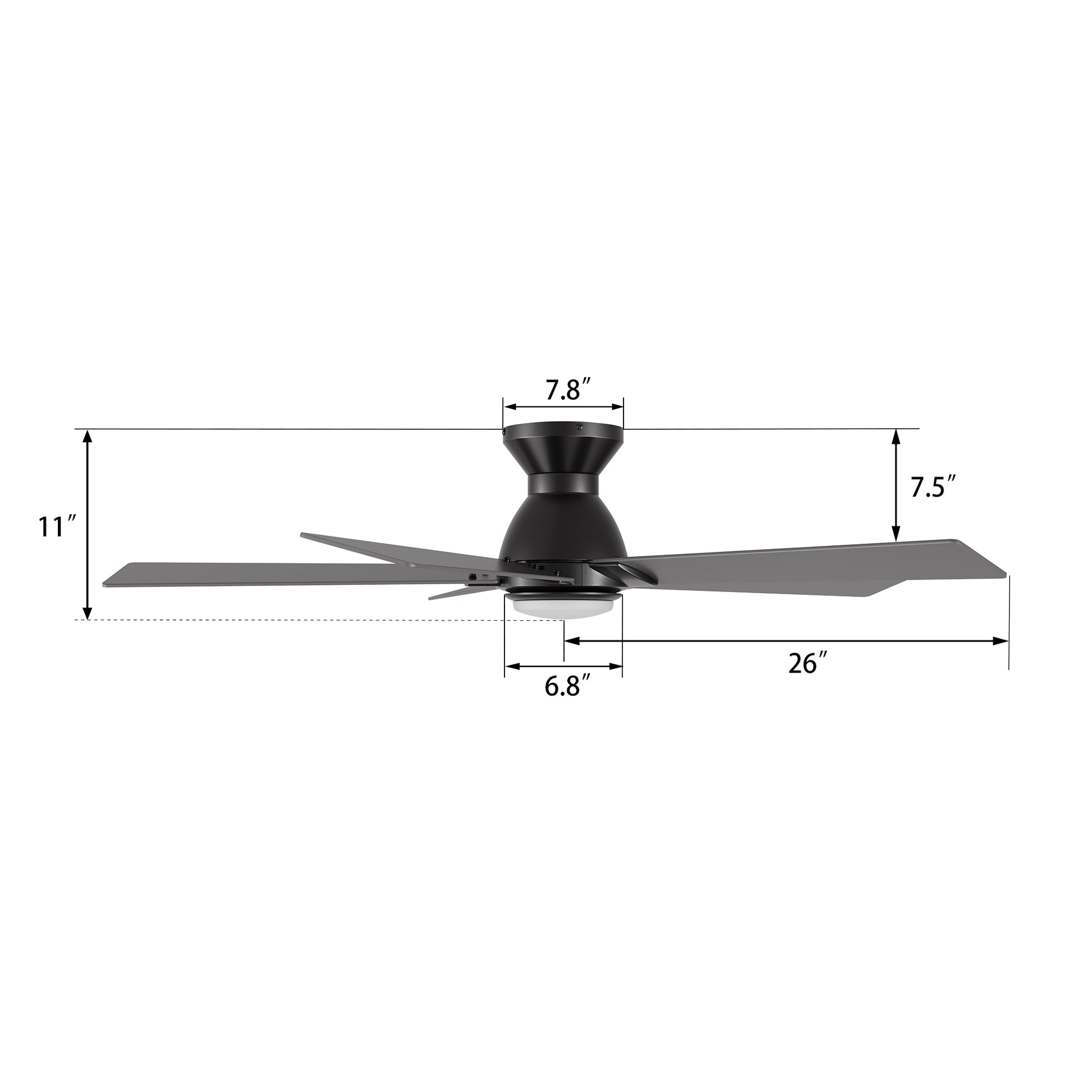 Ascender Smart Ceiling Fan with 5 blades and a 52-inch blade sweep with a flush mounted motor case and modern style blades. The straight and sharp angled fan blades are made of high-quality and ultra durable plywood. The motor case is a soft matte black finish and one of our low profile flush mounted DC motor fans. This fan has a low profile design, installing flush onto a ceiling. The height is only 7.5" from ceiling to blades and 11" from ceiling to bottom of light shade. A dimmable 4000K LED lighting kit that can change between bright white, soft warm light, and a combination of both for a neutral temperature. The fan features Remote control, Wi-Fi apps, Siri Shortcuts, and Voice control technology (compatible with Amazon Alexa and Google Home Assistant ) to set fan preferences.