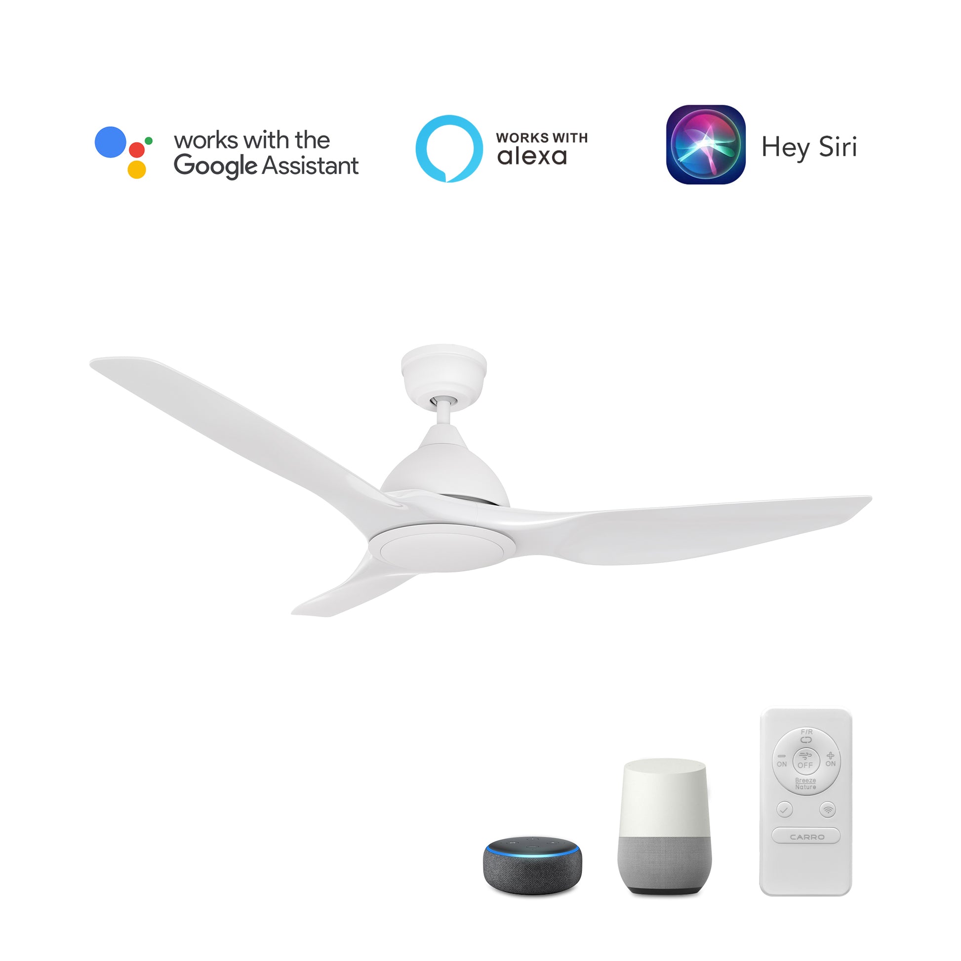 This Carro Home Cranston 52'' smart ceiling fan (No Light) keeps your space cool and stylish. It is a modern masterpiece perfect for your large indoor living spaces. This Wi-Fi smart ceiling an is a simplicity designing with Black finish, use ABS blades. The fan features Remote control, Wi-Fi apps, Siri Shortcuts and Voice control technology (compatible with Amazon Alexa and Google Home Assistant ) to set fan preferences.