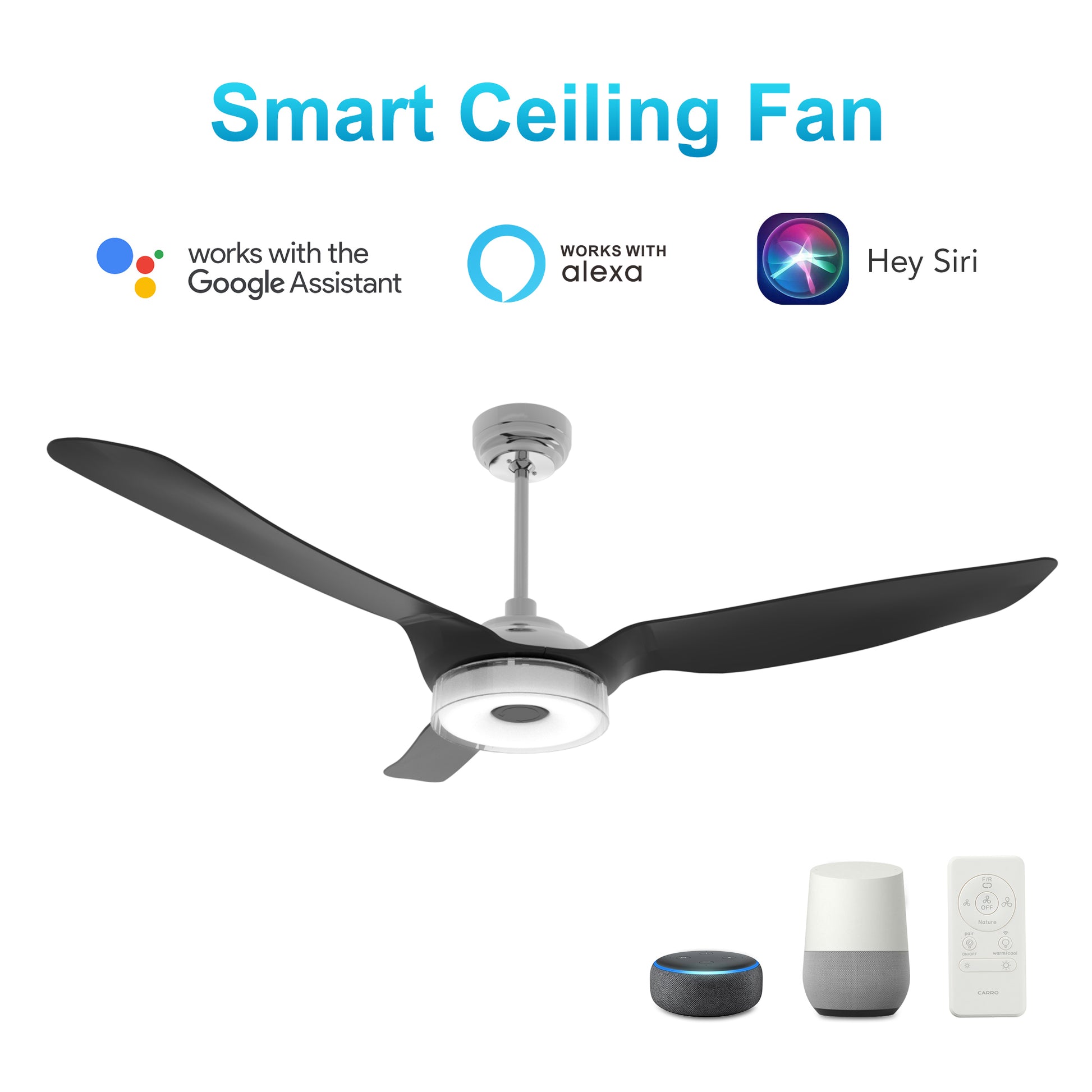 - Control your fan by Alexa, Google Home, Siri, and Carro Home Smart app.