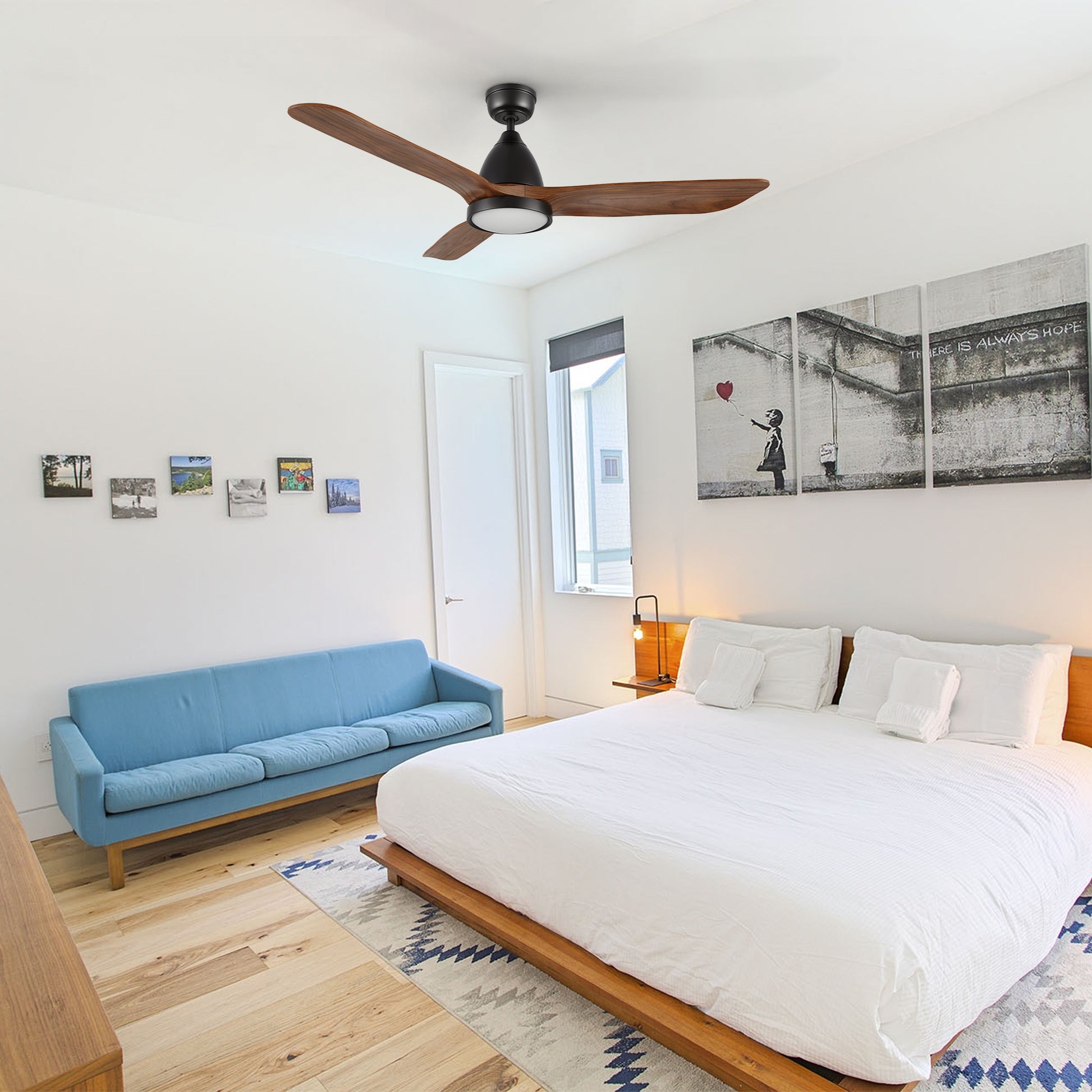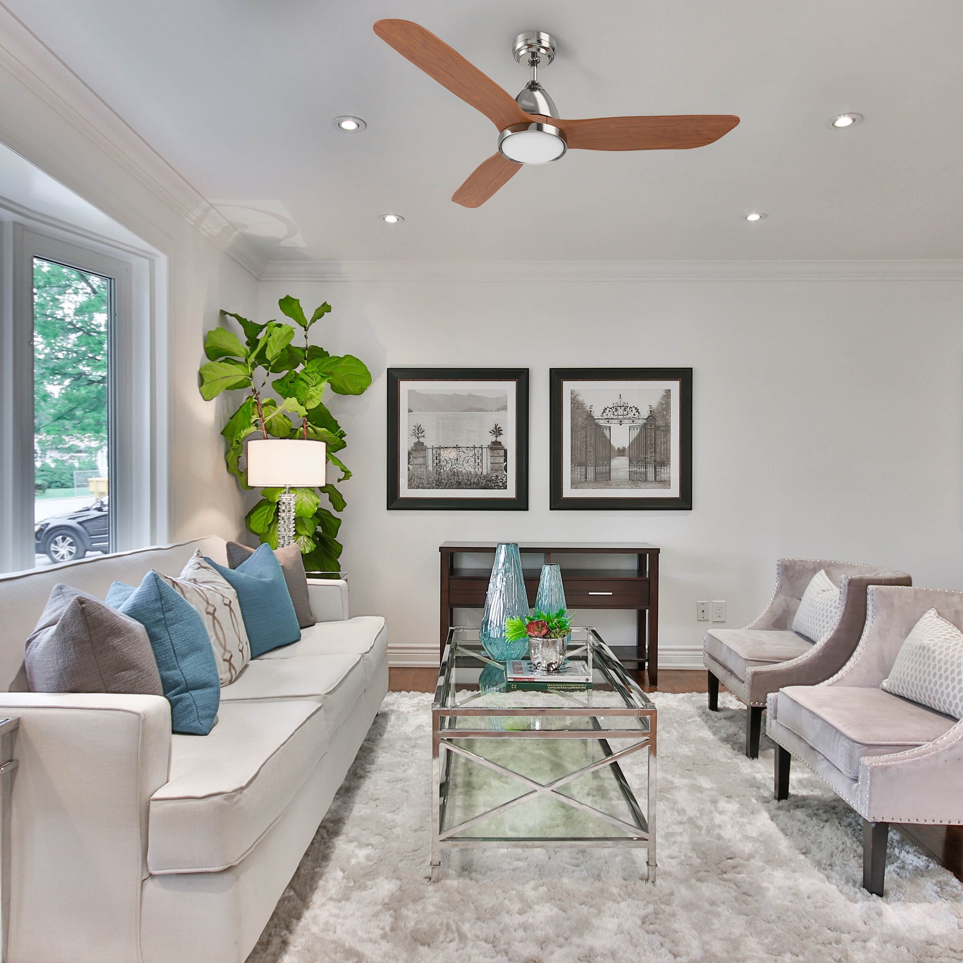 Garrick Smart Ceiling Fan with 3 blades and a 52-inch blade sweep with a sleek cone shaped motor case. The elongated shape fan blades are solid, ultra-durable wood, one of our energy efficient DC motor fans. A dimmable 3500K LED lighting kit that can change between bright white, soft warm light, and a combination of both for a neutral temperature. The frosted glass LED light shade casts soft and yet bright light and adds a touch of sophistication to the ceiling fan. The fan features Remote control, Wi-Fi apps, Siri Shortcuts, and Voice control technology (compatible with Amazon Alexa and Google Home Assistant ) to set fan preferences.