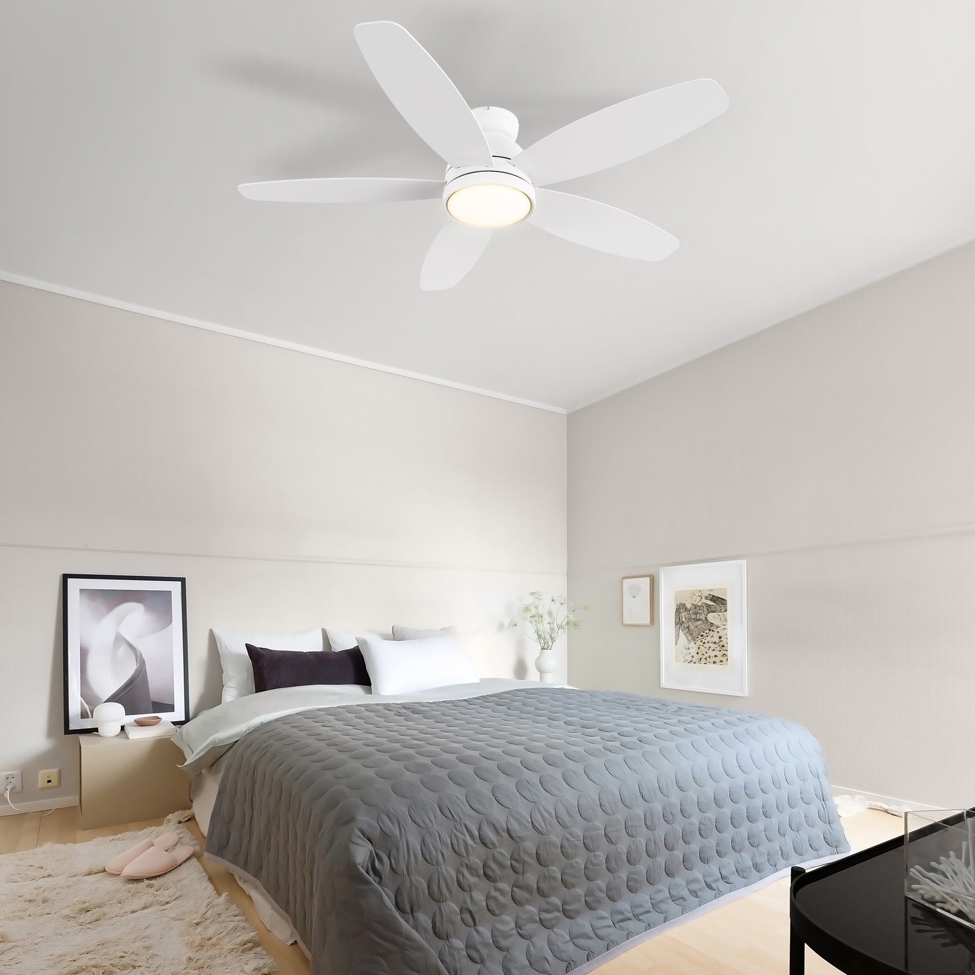 FREMONT Smart Ceiling Fan with 5 blades and a 48-inch blade sweep with a flush mounted motor case and sleek blades. Fremont series is one of our low profile flush mounted DC motor fans. A dimmable 4000K LED lighting kit that can change between bright white, soft warm light, and a combination of both for a neutral temperature. The frosted glass LED light shade is adorned with gold finish detail that adds a touch of sophistication to the ceiling fan. The fan features Remote control, Wi-Fi apps, Siri Shortcut, and Voice control technology (compatible with Amazon Alexa and Google Home Assistant ) to set fan preferences.