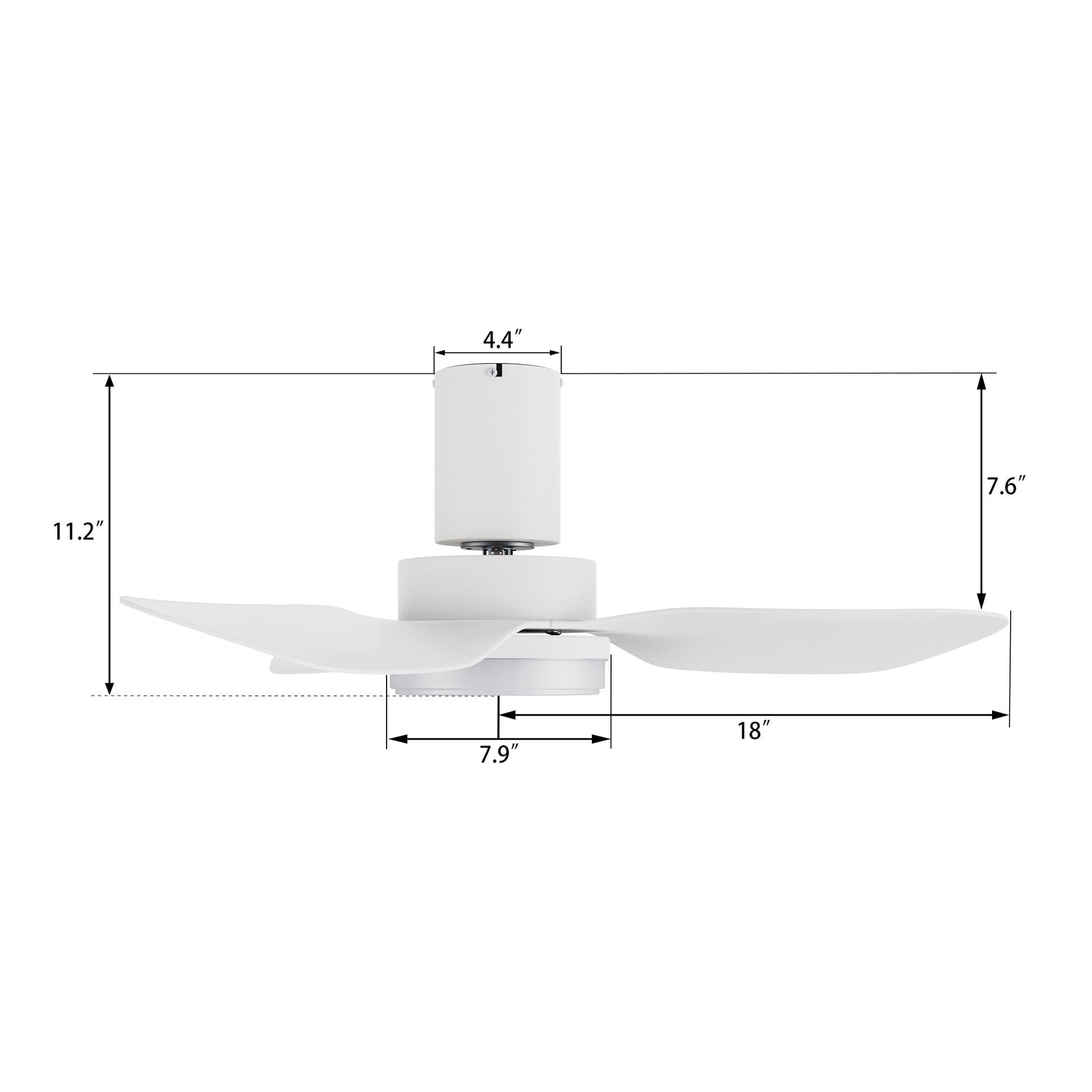 Ryna Smart Ceiling Fan with 3 blades, 36-inch blade sweep with a sleek cylinder motor case, and nature inspired curved fan blades are PP material. This fan has a low profile hugger style, installing flush onto a ceiling. The height is only 7.6" from ceiling to blades and 11.2" from ceiling to bottom of light shade. A dimmable 3500K LED lighting kit that can change between bright white, soft warm light, and a combination of both for a neutral temperature. The opal plastic LED light shade casts soft and yet bright light and adds a touch of sophistication to the ceiling fan. The fan features a Hand-Held Remote control, Wi-Fi apps, Siri Shortcuts, and Voice control technology (compatible with Amazon Alexa and Google Home Assistant ) to set fan preferences.