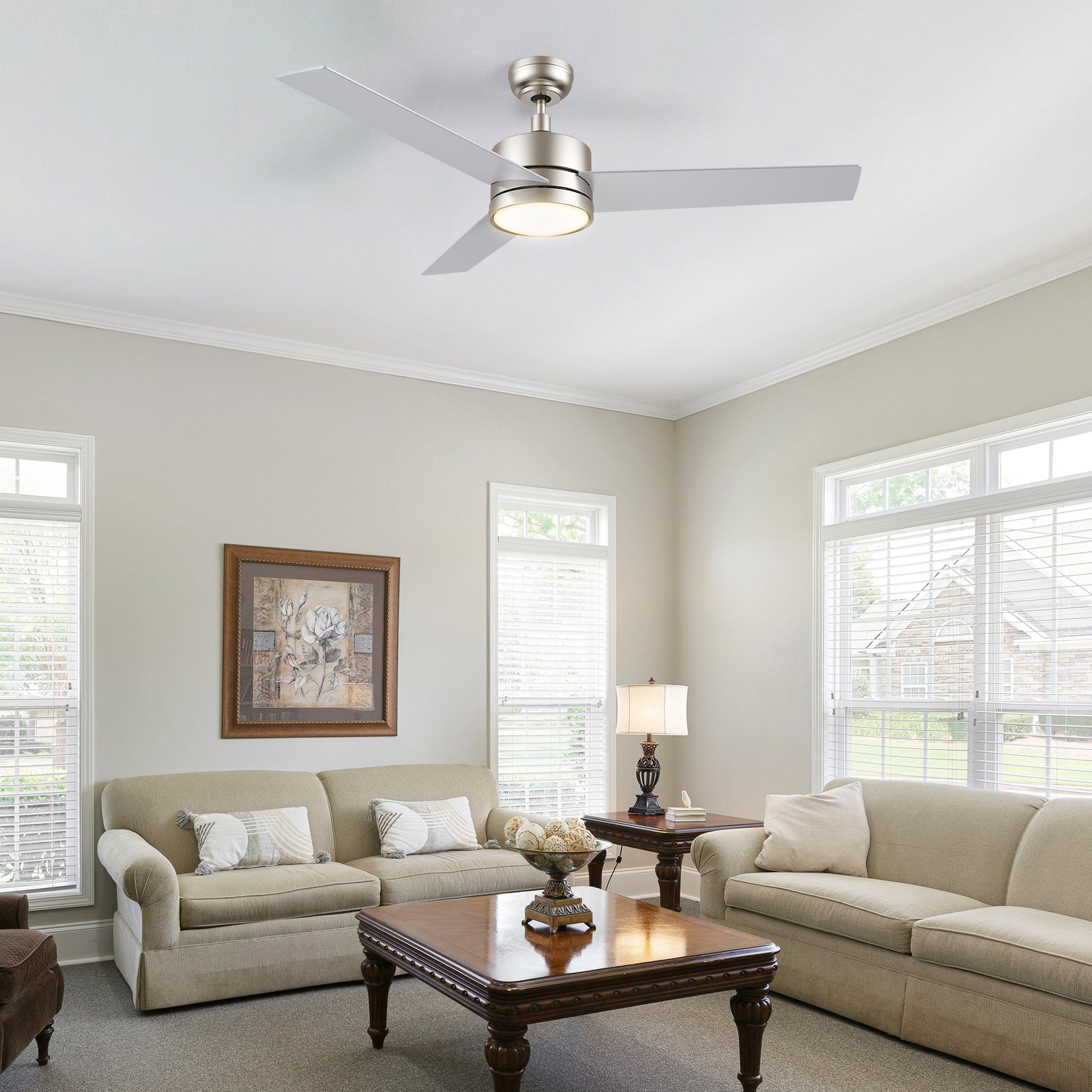 SANTANA 52" Ceiling Fan with equipped with a Stable and Silent Motor. The SANTANA 52" Ceiling Fan will keep your living space cool, bright, and stylish. This soft modern masterpiece is perfect for large indoor living spaces. The fan boasts a simple design, Plywood blades, and an integrated 3500K LED light. Additionally, fan control allows you to easily set fan speeds and lighting preferences.