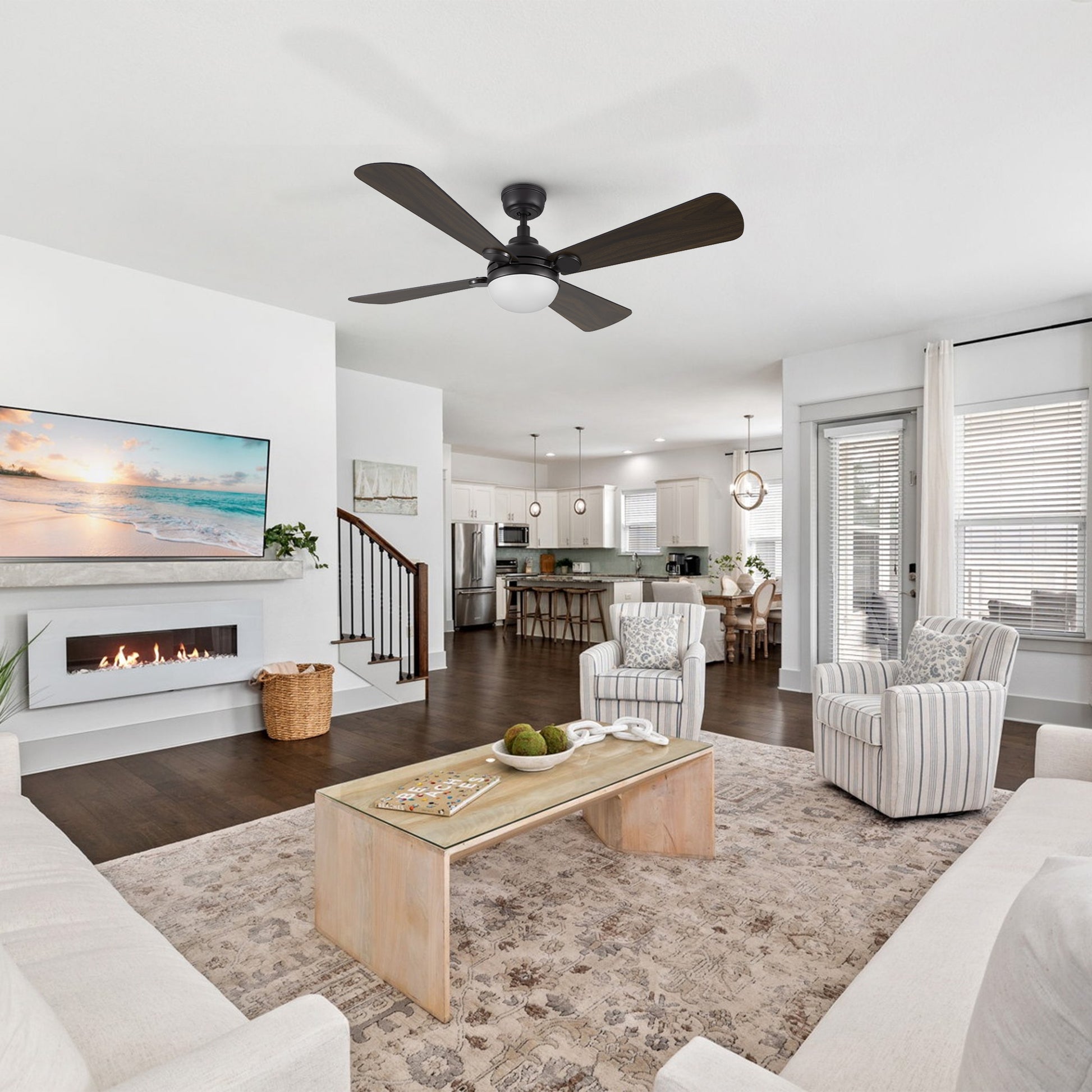 With an efficient and quiet motor, this 52" ceiling fan comes with a remote control and light kit. Your living area will remain cool, bright, and stylish with Zelda. Large indoor living areas are ideal for this delicate modern masterpiece. The fan has a straightforward design with plywood blades, a 3500K LED light built in, and a sleek finish.